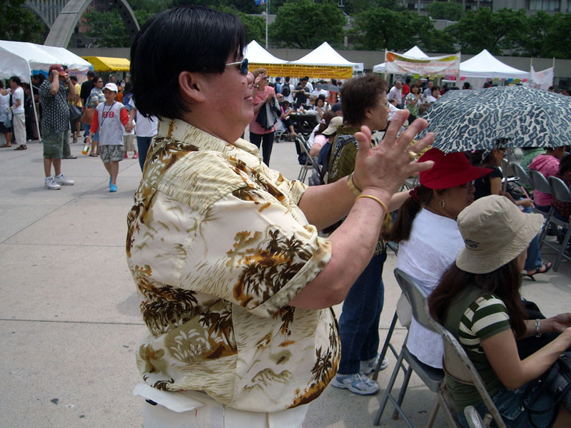 法轮功学员应邀参加多伦多菲律宾独立日庆祝活动图为游客(右)当场学功2007-6-9