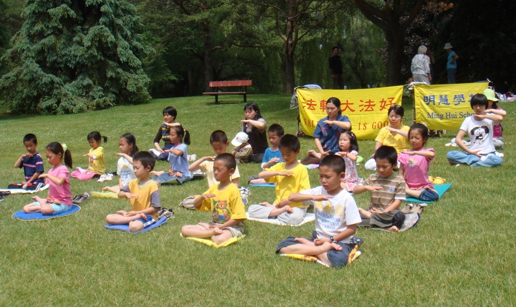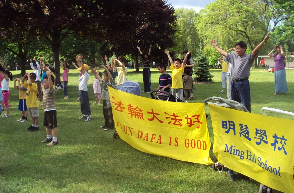 明慧学校的小弟子们在多伦多国际龙舟节炼功洪法讲真相