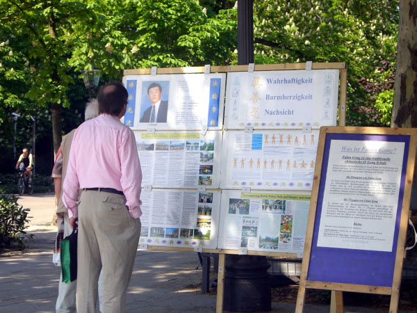 法轮功学员在德国小城Baden-Baden举办信息日图为民众图片前凝视深思2007-4-28