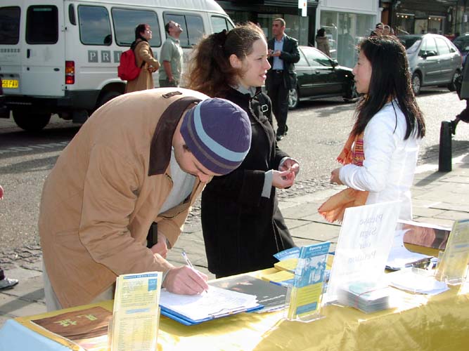 伦敦法轮功学员来到闹市区Wood Green图书馆前讲真相 图为行人签名支持法轮功