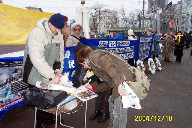 俄罗斯学员在莫斯科市中心、塔斯社大楼旁边的广场集会,要求停止迫害法轮功 图为签名呼吁停止迫害 俄罗斯 2005-1
