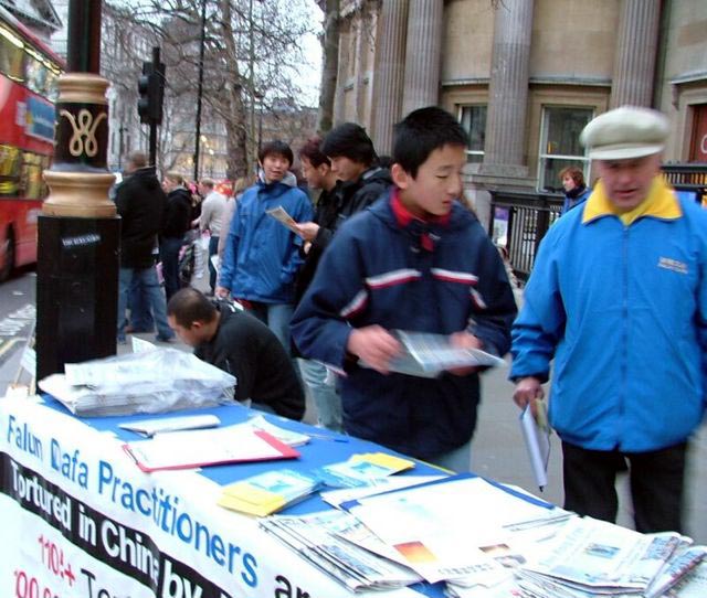 英国学员在伦敦市中心介绍法轮功和揭露迫害 图为正在发真相资料的学员