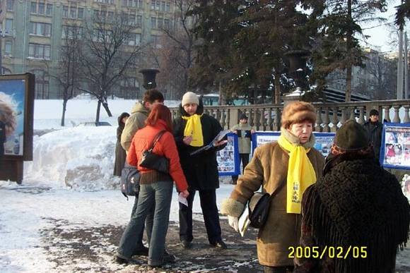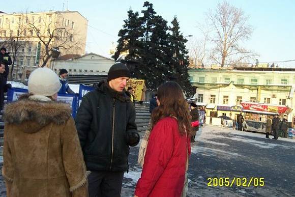 俄罗斯学员在莫斯科市中心、塔斯社大楼旁边的广场集会,要求停止迫害法轮功 图为学员讲真相 俄罗斯 2005-1