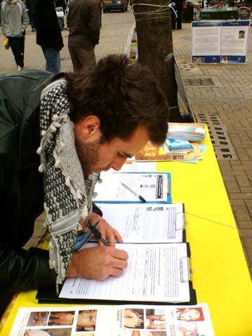 法轮功学员在捷克济诺摩市征签和揭露迫害 群众签名呼吁释放被关押的法轮功学员