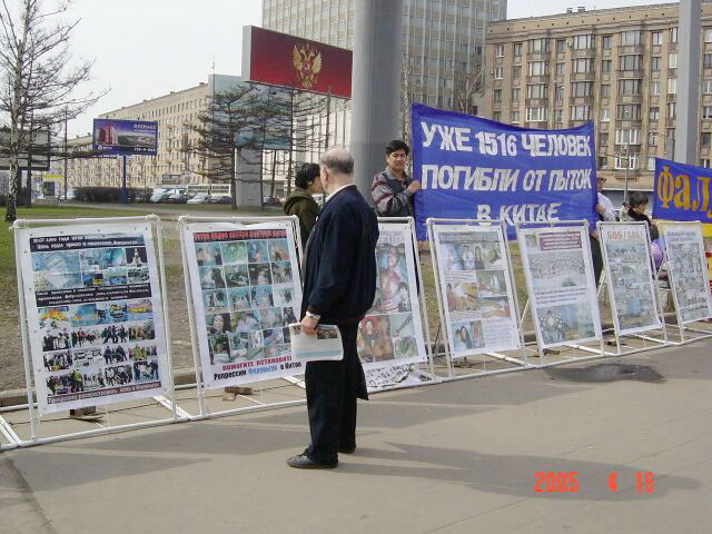 法轮功学员在俄罗斯圣彼得堡市地铁站附近人流量最多的路口展示展板及横幅,传播真相
