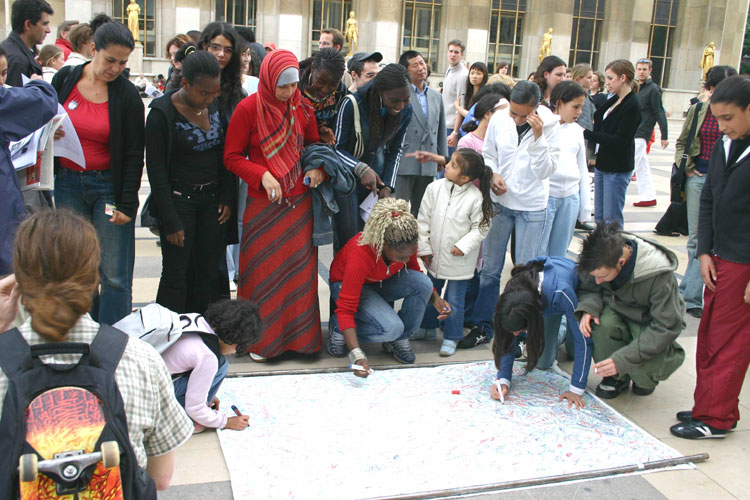 法国法轮功学员们在位于艾菲尔铁塔正对面的巴黎人权广场(Parvis des Droits de l’Homme au Trocadéro)讲真相 图为游客签名支持反对迫害法轮功