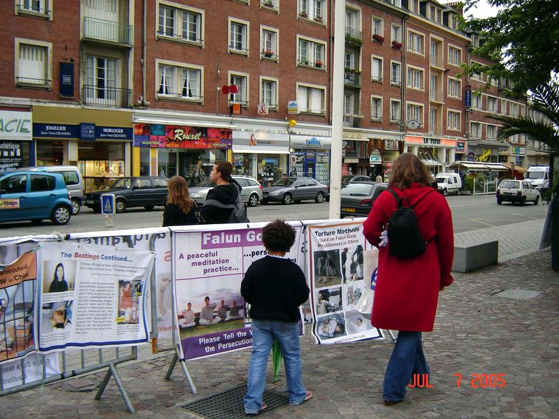 法国法轮功学员在诺曼底省讲真相第四站勒阿乌尔,介绍法轮功及在中国发生的残酷迫害