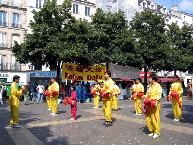 法国法轮功学员7月14日法国国庆节到蓬皮杜艺术中心附近的无辜者广场举行洪法活动