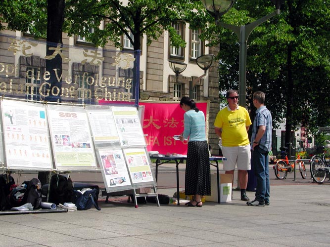 7.20六周年,德国法轮功学员柏林市中心举行反迫害活动,向德国民众讲清真相,呼吁制止迫害