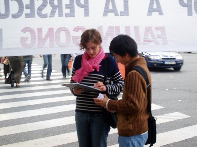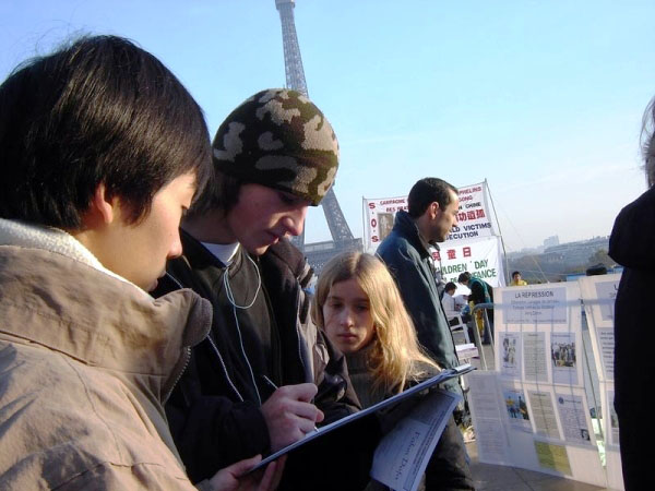 首轮巴黎巡回洪法讲真相活动圆满结束 图为民众签名呼吁立即停止迫害