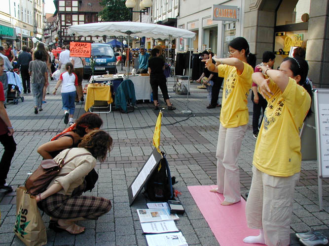 德国法轮功学员在帕骚市中心的反酷刑展上演示炼静功.