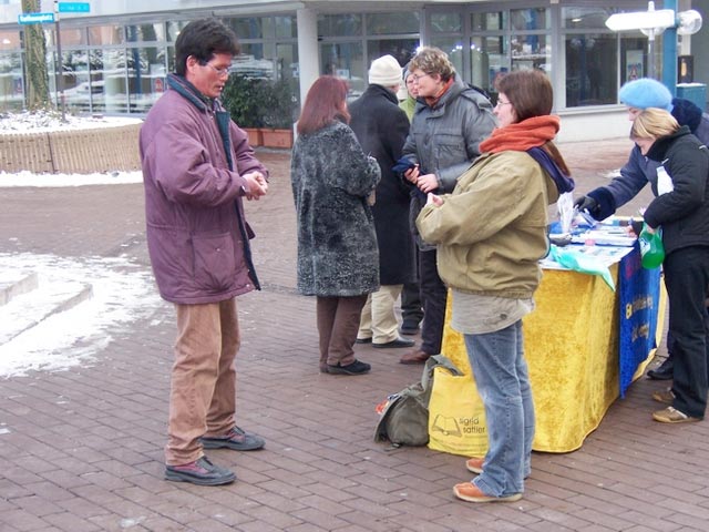 芬兰学员在赫尔辛基洪法,讲真相。民众关注迫害真相 2005-11-26