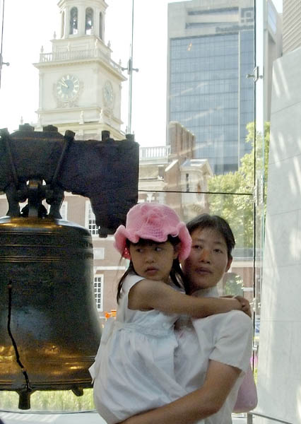 4岁女孩法度和妈妈戴志珍来到费城自由钟 向人们讲述她们的遭遇 抗议中国江氏集团对法轮功的迫害