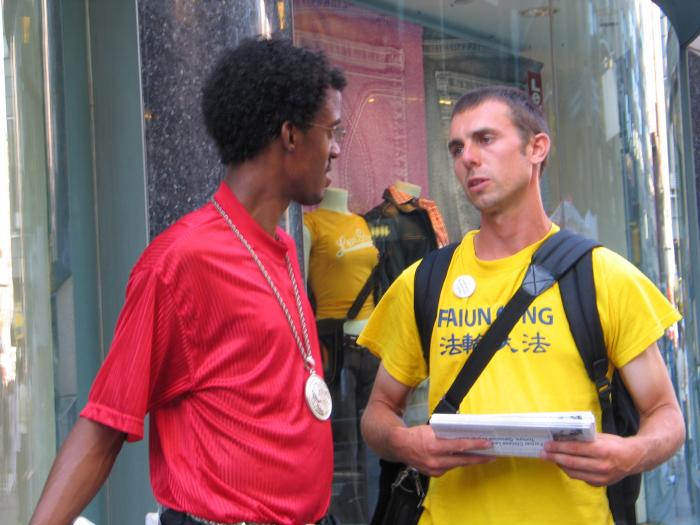 法轮功学员在纽约讲真相,引起了众多纽约人的同情和支持
