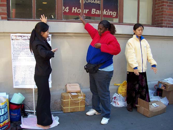 法轮功学员在纽约街头讲真相,图为纽约市民学功法