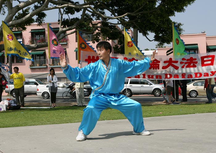美国加州洛杉矶学员在圣塔莫尼卡海滨公园举办活动,庆祝法轮大法洪传世界十六周年,图为前中国武术冠军李有甫表演拳术 2008-5-11