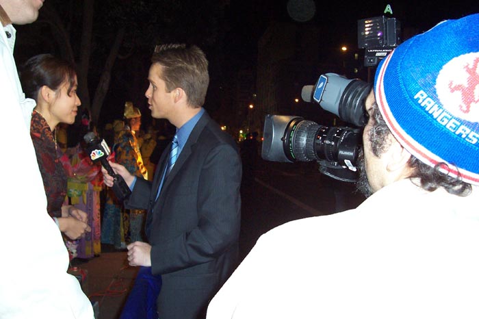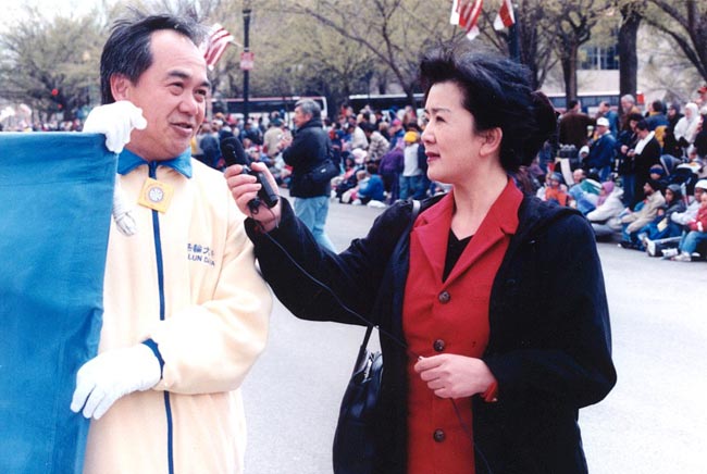 法轮功学员参加2002年华盛顿DC樱花节游行,图为学员在接受记者采访