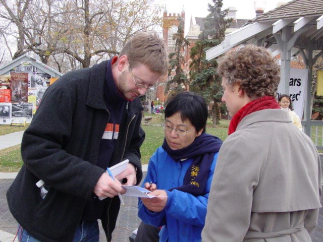 法轮功学员在斯德歌尔摩,集征签名活动揭露活摘器官的罪行,国会议员Christer Winback接受媒体的采访