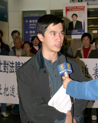台湾宜兰县议会通过“谴责并呼吁国际社会制止中共对法轮功的暴行”提案,图为法轮功学员接受媒体采访2006-5-22