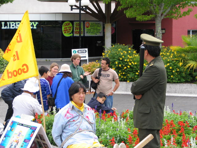 北加州学员州府前举办真人模拟反酷刑展揭露中共活摘器官暴行 图为学员接受加州州府一电视台的采访2006-7-26