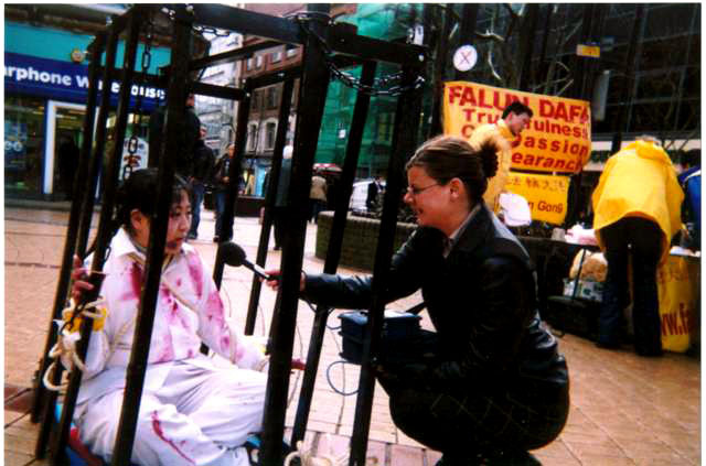 德国法轮功学员在市中心揭露中共活摘器官暴行,图为学员接受当地电台记者的采访2006-5-26