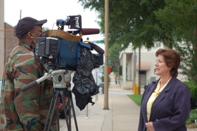 法轮功学员在美国密西西比州Starkville举行集会反酷刑展图为WCBI电视台记者采访2008-8-16