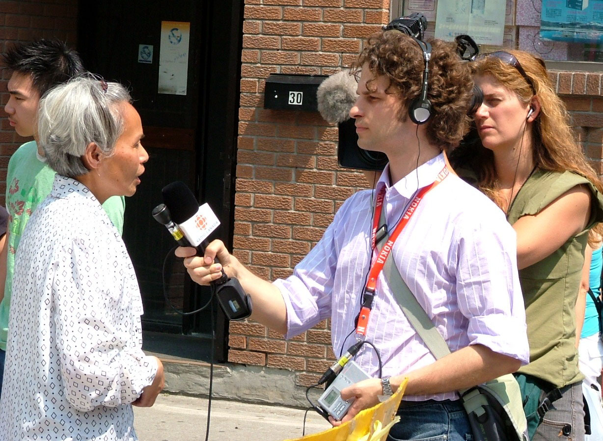 加拿大学员在蒙特利尔揭露中共活摘法轮功学员器官的罪恶。图为学员接受CBC电台、电视台采访 2006-7-8