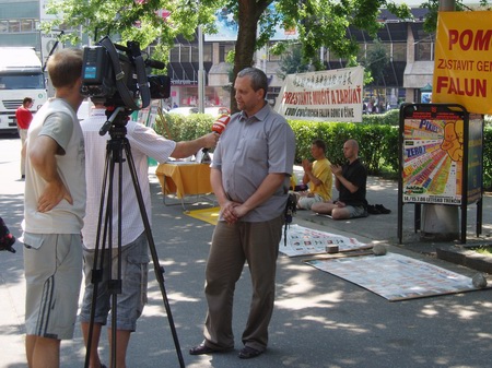 斯洛伐克法轮功学员揭露中共活摘法轮功学员器官的罪行 图为学员接受媒体采访 2006-7-15