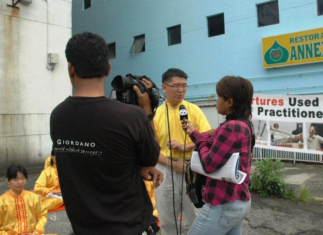 台湾法轮功学员呼吁新加坡当局勿做中共迫害法轮功的帮凶 图为学员接受媒体采访 2006-7-20