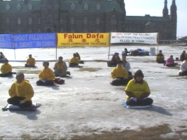 为了制止江氏流氓集团对中国大陆法轮功学员下达的开枪射杀的命令 加拿大法轮功学员在渥太华国会山庄前举行36小时绝食请愿活动
