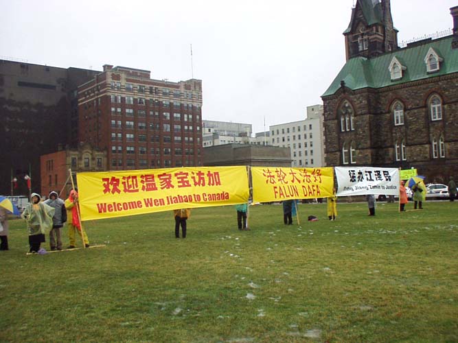 温家宝继续访加旅程 法轮功学员冒雨请愿