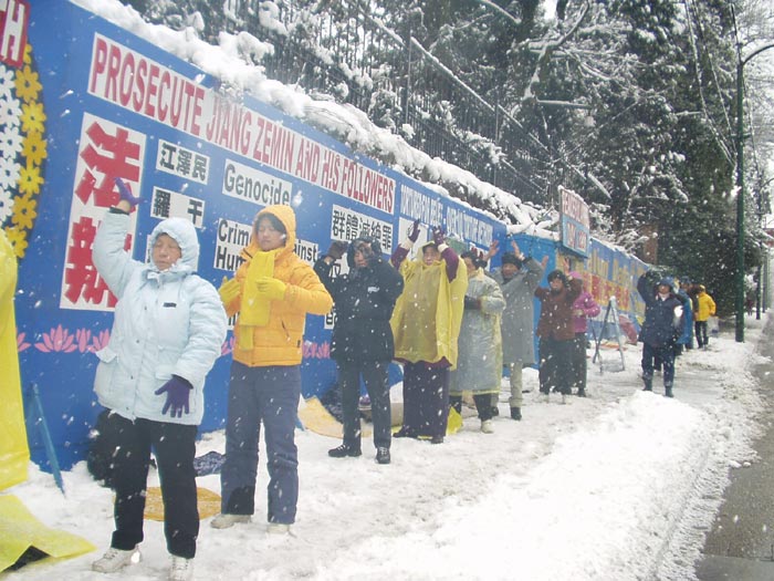 加拿大温哥华法轮功学员冒着大雪,坚持在中领馆前和平请愿,要求停止迫害法轮功,法办迫害法轮功的元凶 加拿大 2005-1-8
