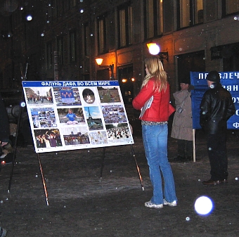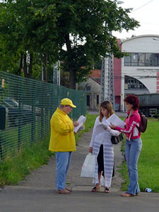 俄罗斯学员圣彼得堡集会 呼吁制止迫害法轮功 图为学员们正在给路人讲真相