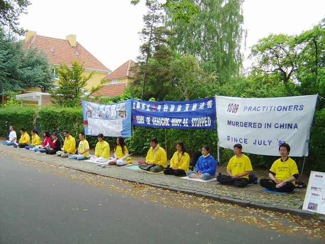 2004年5月27、28日,德国法轮功学员在柏林中国使馆前请愿,支持美国芝加哥的起诉江泽民案