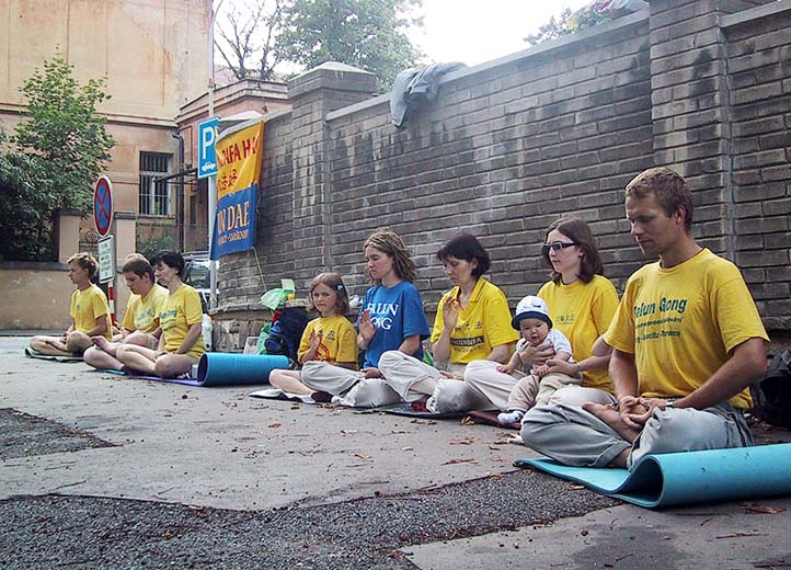 2004年7月20日,捷克的法轮功学员在驻布拉格中使馆前和平打坐炼功36小时,希望人们关注在中国发生的迫害