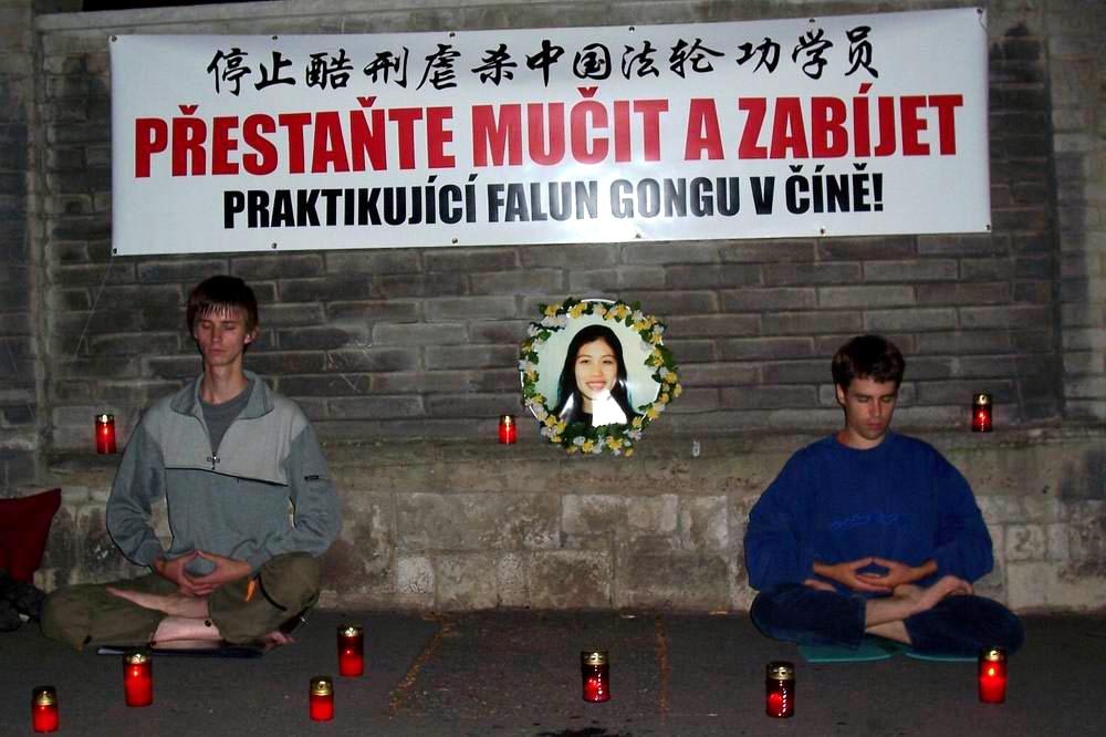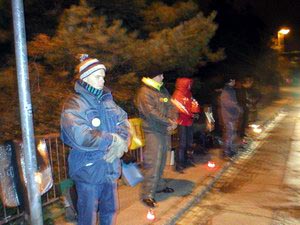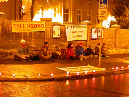 2004年12月31日,捷克法轮功学员聚集在布拉格的中使馆前,以烛光纪念在中国大陆遭迫害致死的同修