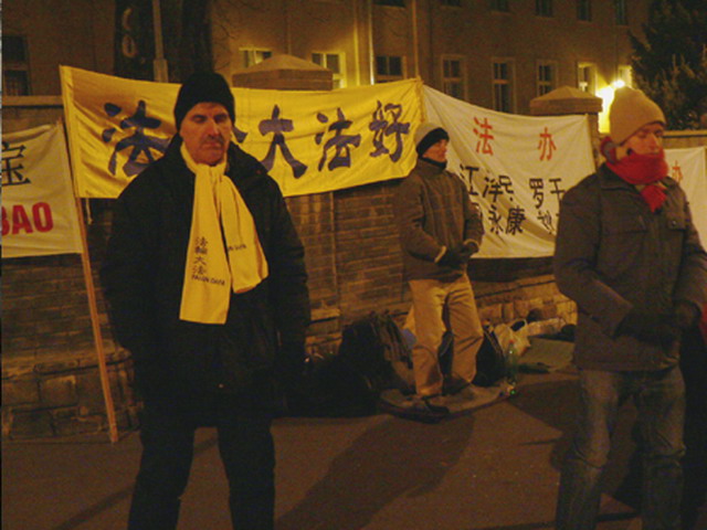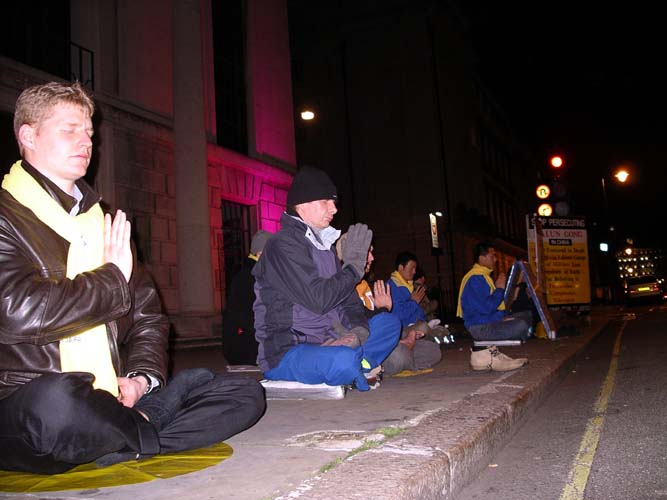 英国法轮功学员寒风中静静的在胡锦涛下榻处外面请愿 呼吁停止迫害
