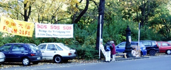 胡锦涛访问德国 法轮功学员在请愿地点炼功