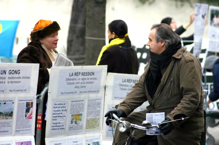 巴黎学员在中领馆前读公告,讲真相,劝中共官员弃恶从善。图为民众了解真相,签名声援法轮功 2005-10-21