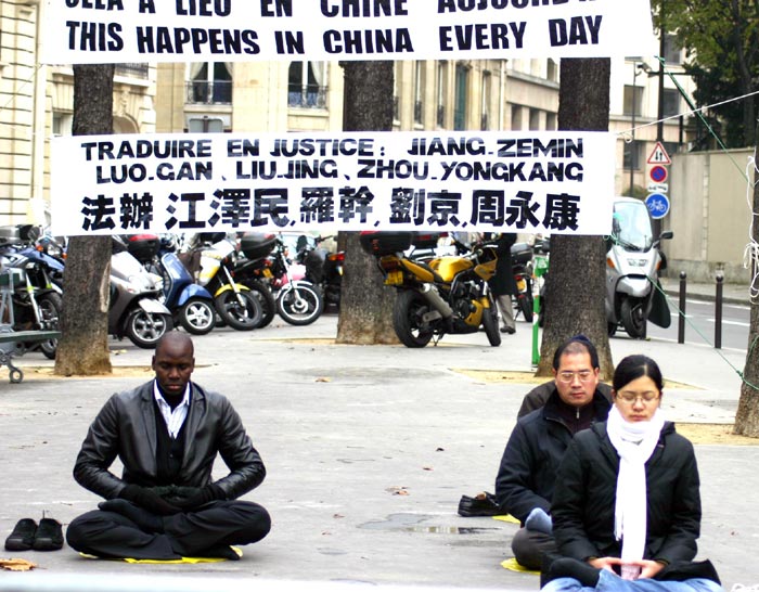 2004年10月29日,法国学员在巴黎的中使馆前和平请愿,要求停止迫害,并公审江泽民、罗干、刘京、周永康