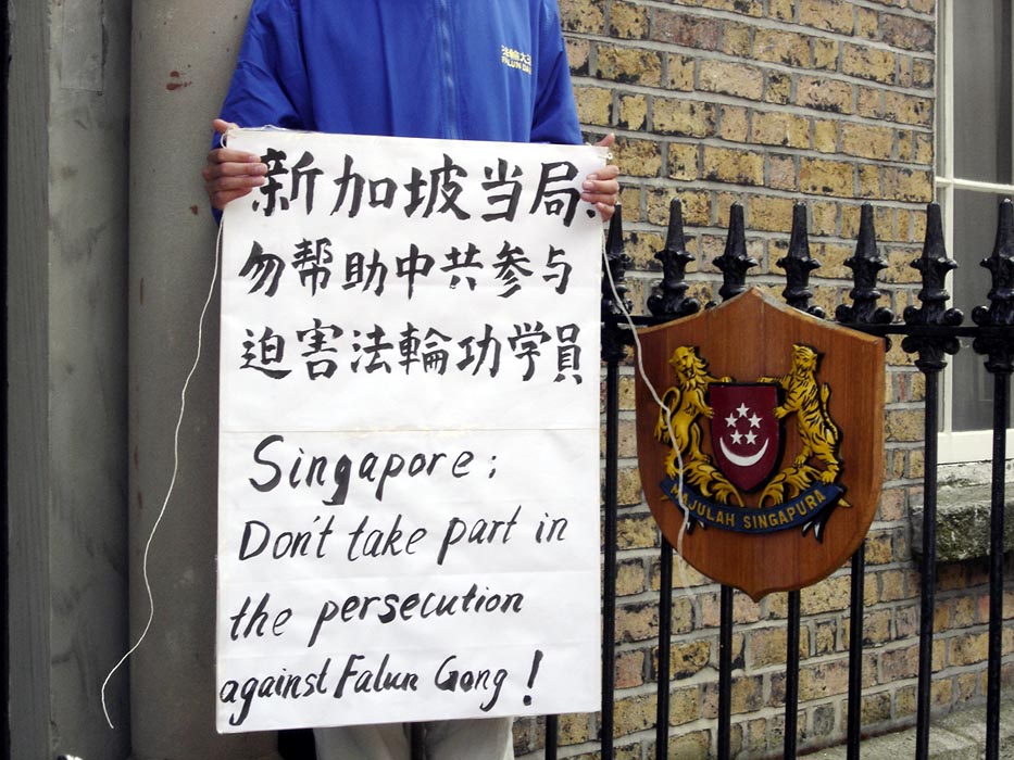英国法轮功学员在新加坡驻英使馆前请愿,呼吁新加坡当局停止参与迫害法轮功