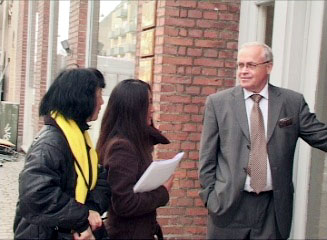 法轮功学员向德国总统科勒面交请愿信 图为拜恩州电视台“Quer”捕捉到手持请愿信的法轮功学员向总统夫人讲真相的镜头
