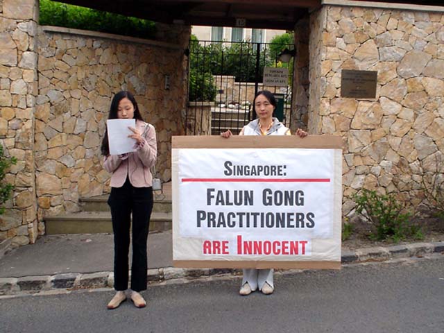 法轮功学员在新加坡驻匈牙利领馆前和平请愿,呼吁新加坡政府停止参与迫害法轮功