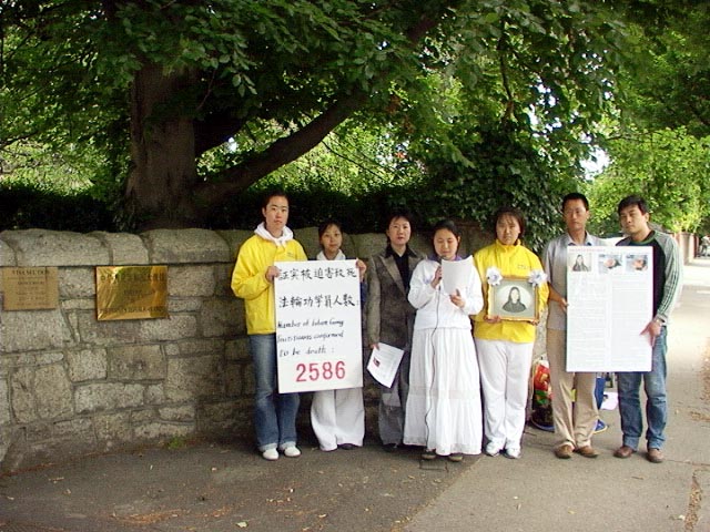 惊闻曾庆红在南非访问涉嫌雇凶枪击欲对其起诉的法轮功学员,爱尔兰法轮功学员于2004年6月29,30日在中使馆前和平抗议