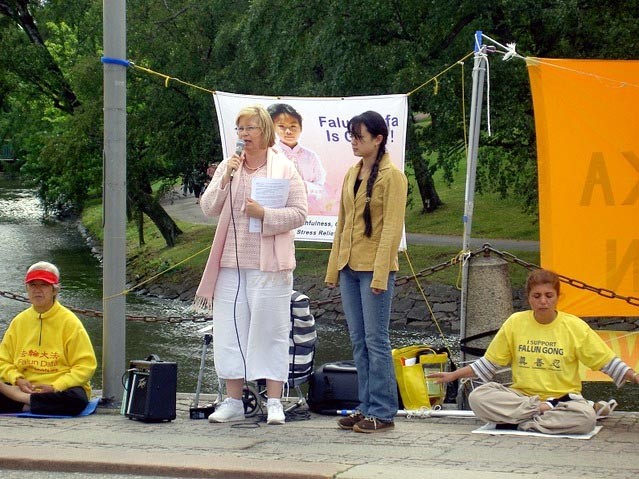 芬兰法轮功学员中使馆前和平请愿呼吁停止迫害法轮功 图为学员在炼功