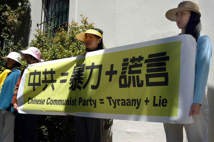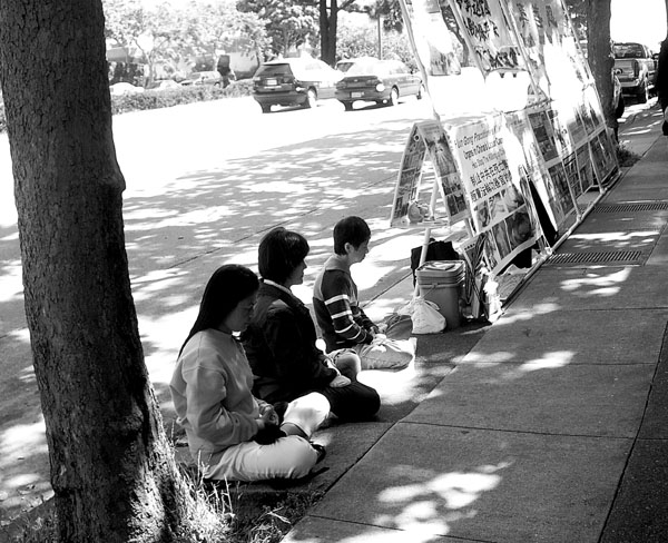 法轮功学员在美国旧金山中领馆前顶着严寒酷暑几年的和平抗议中共的残酷迫害