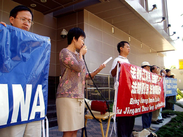 法轮功学员在旧金山中领馆前召开新闻发布会,图为剑桥留学生呼吁营救被绑架的丈夫2006-7-30