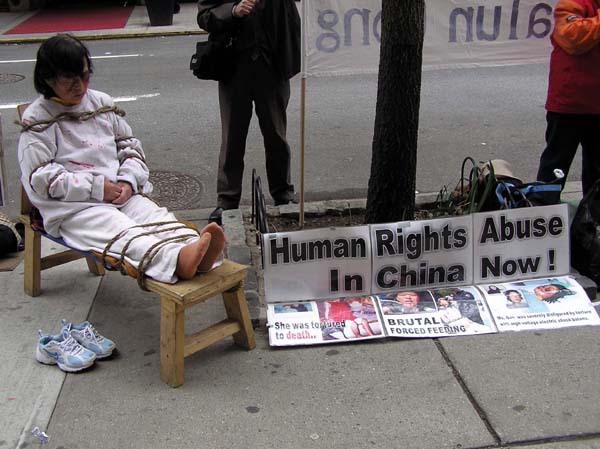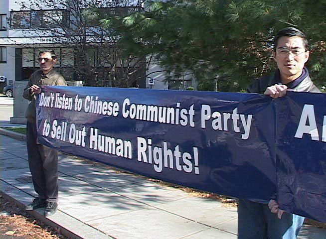 法轮功学员在中共党魁来美时沿途抗议中共对法轮功灭绝人性的残酷迫害 2006-4