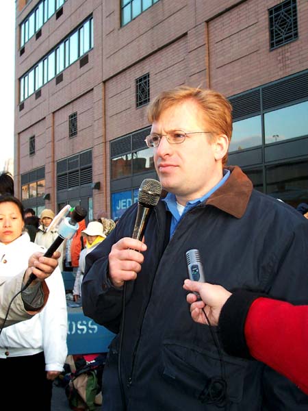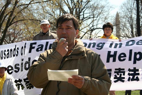 法轮功学员呼吁布什访华时向中共领导人提出停止镇压法轮功的要求 图为Martin McMahon律师在发言