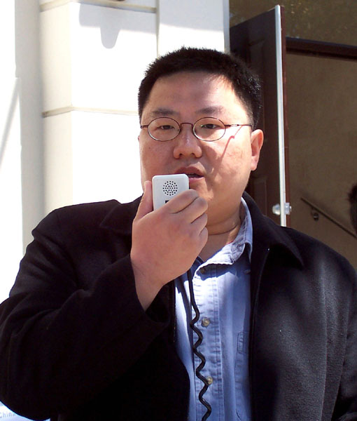 洛杉矶民众中领馆前集会 谴责中共恶警强奸兽行 图为法轮功学员李彬以亲身经历揭露中共迫害的惨烈和毫无人性2005-12-7